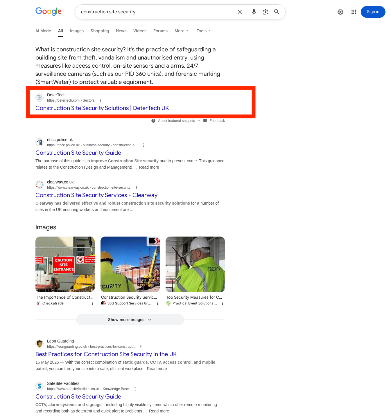 - Detertech now rank #1 on Google for "construction site security" — ahead of Clearway, Safesite and WCCTV.